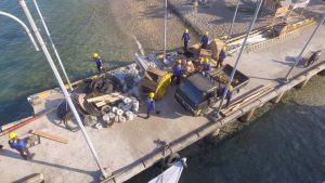 Logistik yang berada di dermaga Pulau Moyo mulai dipindahkan dengan bantuan kendaraan ke lokasi yang telah ditentukan. Petugas PLN memastikan seluruh logistik dibawa dengan baik ke lokasi pemasangan instalasi kelistrikan. FOTO DOK PLN