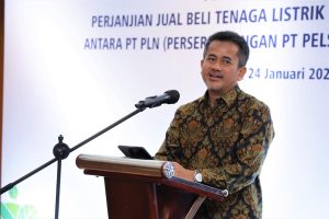 General Manager PLN UID Kalselteng Muhammad Joharifin saat memberikan sambutan dalam kegiatan penandatanganan Perjanjian Jual Beli Tenaga Listrik (PJBTL) Additional Demand sebesar 24,5 Mega Volt Ampere (MVA) dengan PT Pelsart Tambang Kencana (PT PTK) Cluster Tarjun, pada Rabu (24/1), di Jakarta. FOTO DOK PLN